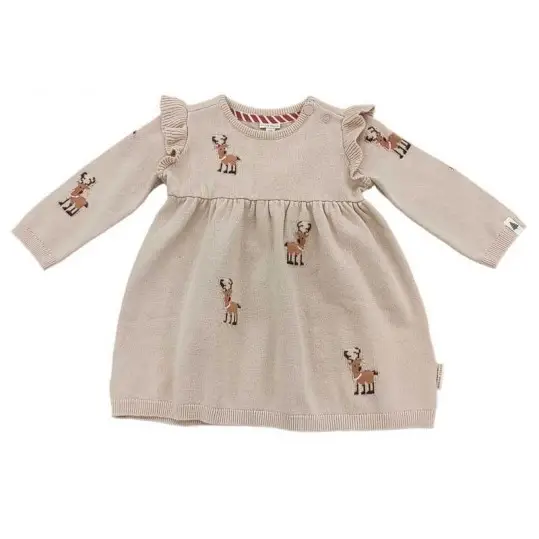 Quest’inverno, questo vestito per bambine è disponibile nelle taglie dalla neonata fino a 4 anni. È l’abito perfetto per godersi il periodo natalizio. Presenta maniche lunghe, un design beige con stampa di renne e dettagli a balze sulle spalle.