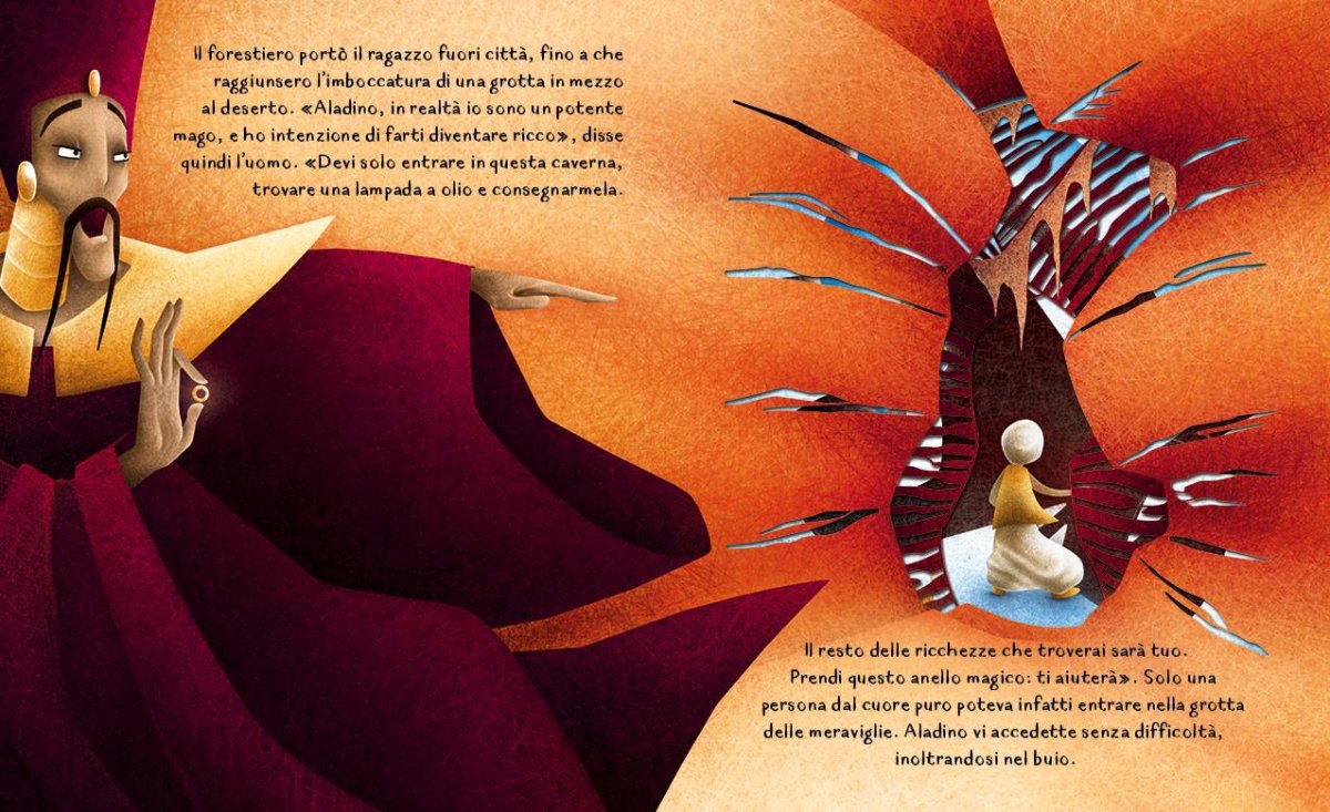 Nel cuore di una fantastica Arabia, il giovane Aladino entra in una misteriosa grotta alla ricerca di una lampada dai poteri prodigiosi, dando così inizio a una straordinaria avventura tra palazzi incantati, maghi impostori, una bellissima principessa e un Genio fatato! Scopri una delle più belle fiabe d’ispirazione orientale attraverso le pagine finemente intagliate al laser e lasciati conquistare dalla sua magia.