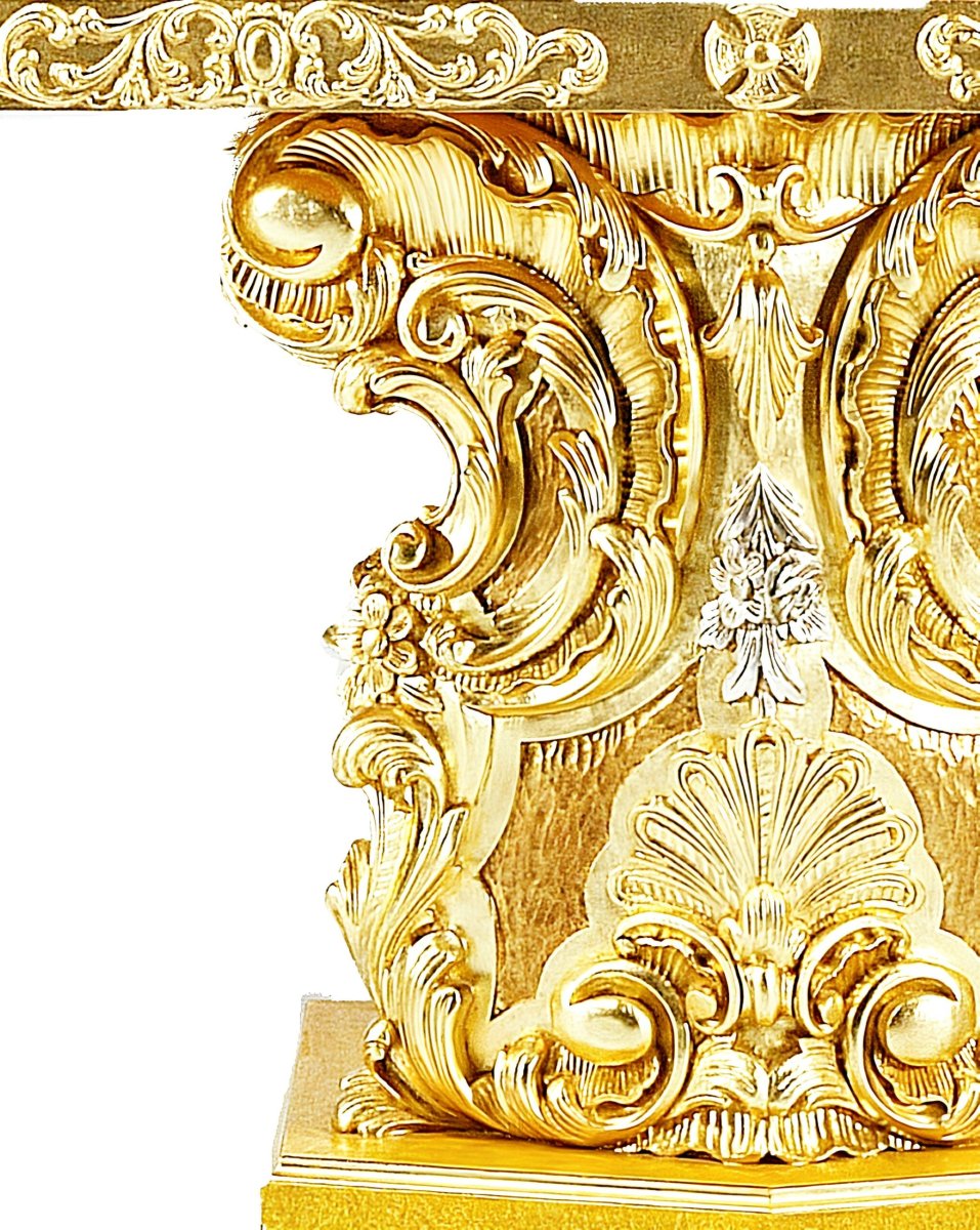 La ricca colonna affianca al motivo della conchiglia ornati e ghirlande che si intrecciano in un insieme armonico.