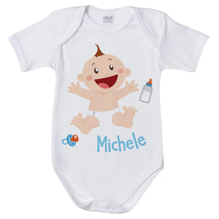 Pratico per le clip riportate sulla spalla e sotto le gambe, il tuo meraviglioso body neonato con bottoncini sarà un grazioso regalo che potrai fare ad un bimbo o bimba. Affidati a noi per la creazione dei tuoi capi d’abbigliamento pensati anche per i più piccoli. Personalizzalo anche con nome.