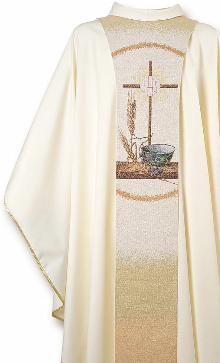 Lo scapolare, ottenuto con fine lavorazione a telaio, raffigura simboli eucaristici.