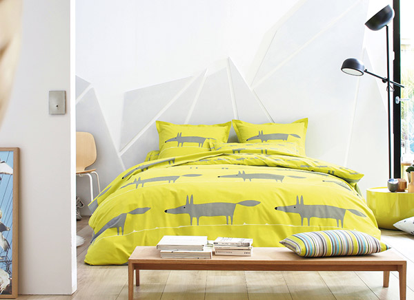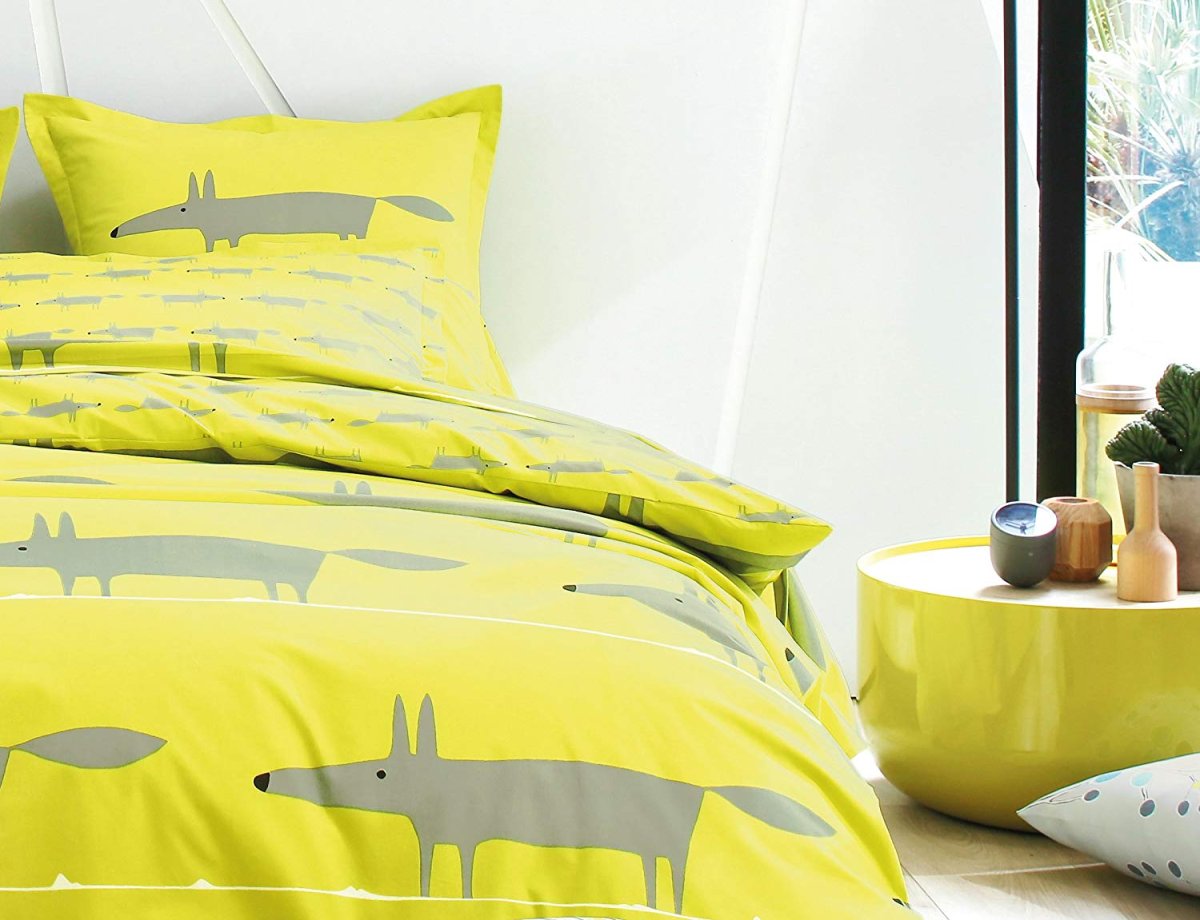 Copripiumino matrimoniale Mister Fox Blanc des Vosges con disegno volpe nel colore giallo e azzurro – Disponibilità immediata e spedizione gratuita