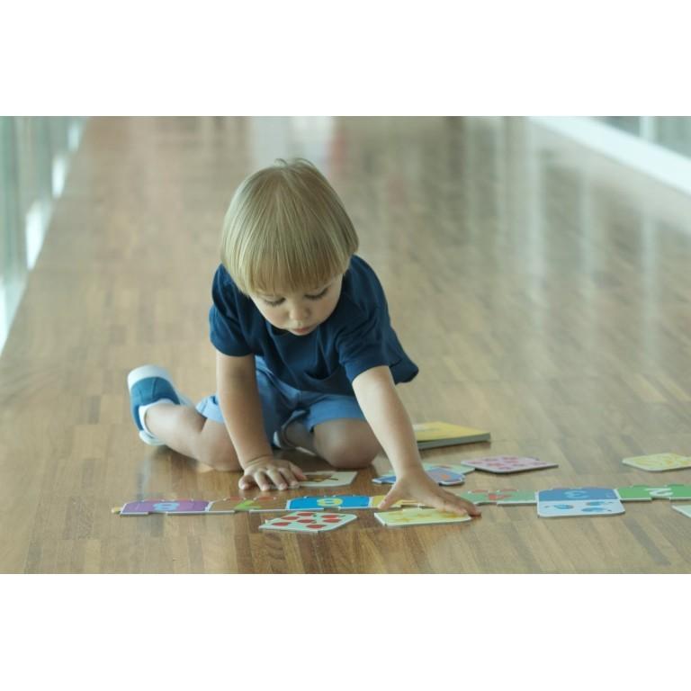 Un libro di 10 pagine e un puzzle di 10 pezzi giganti per creare un trenino e imparare le lettere dell’alfabeto.