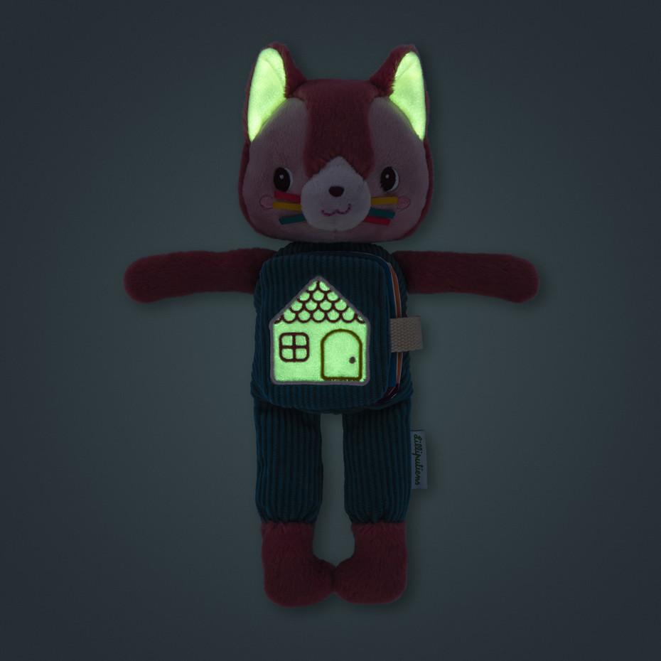 Pronta per la tua favola della buonanotte, Jeanne? Questo peluche da 27 cm è ideale per accompagnare i più piccoli a letto, a partire dai 6 mesi di età. Grazie al suo libro illustrato in tessuto integrato e alla funzione fosforescente, la gatta Jeanne conosce a memoria i rituali della buonanotte. Tiene compagnia al tuo bambino e, quando la luce si spegne, emette una luce soffusa. La sorpresa di questo peluche Lilliputiens sono le sue orecchie e la casetta sulla pancia che si illuminano al buio: sì, è un peluche fosforescente! Più delicata di una luce notturna, stimolerà l’immaginazione del tuo bambino durante il giorno e lo rassicurerà di notte. Grazie ai suoi motivi luccicanti, è impossibile perdere il peluche del gatto di notte. Ma non è tutto! Il piccolo libro di Jeanne dedicato al pancino racconta una storia! Prendetevi il tempo di osservarlo in famiglia e di scoprire i rituali serali della nostra piccola Jeanne e dei suoi amici. Indossa il pigiama, lavati i denti, un bacio grande… La morbidezza, il faccino amichevole e i dettagli del peluche lo rendono un vero amico della buonanotte. Con i suoi motivi scintillanti e la piccola etichetta ricamata, sarà sempre a disposizione per le storie della buonanotte e per le coccole durante il pisolino. Il peluche misura 20 x 8 x 27 cm, è realizzato in poliestere e cotone ed è lavabile in lavatrice a 30°. Fai sogni d’oro con questo morbido peluche che racconta storie!