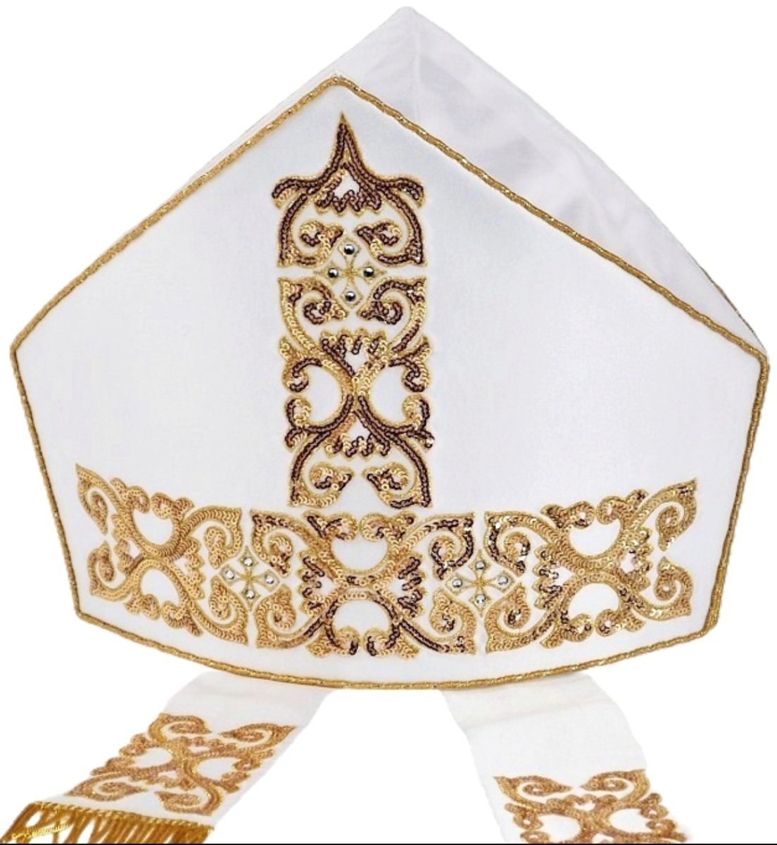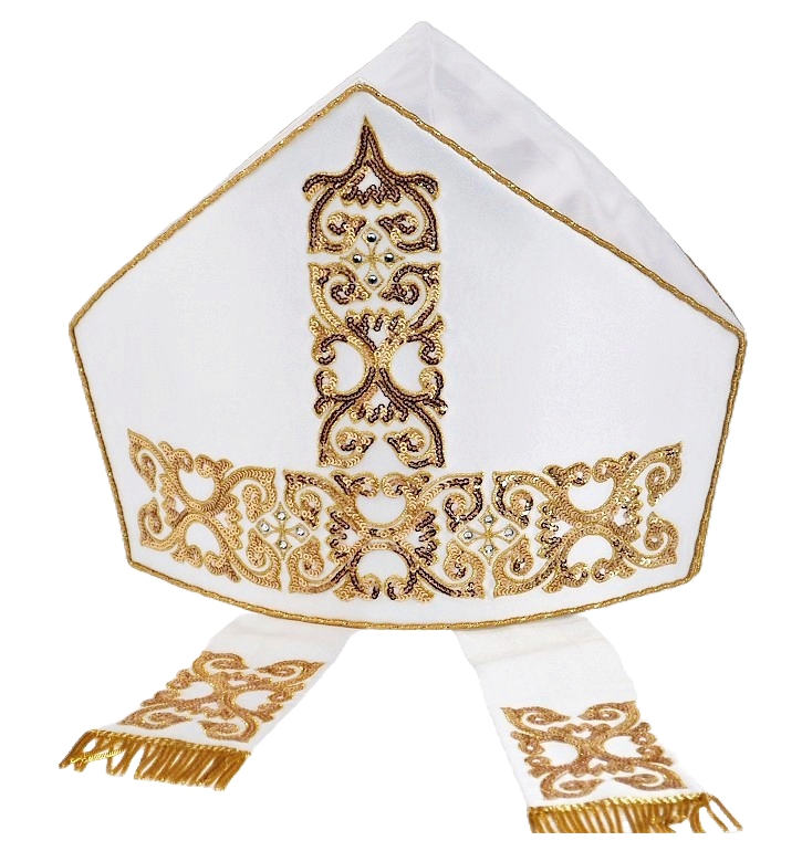 mitria in raso misto seta con ricami in oro e pailettes.