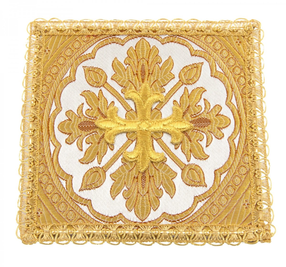 E’ ornata di una fine passamaneria sui lati e dall’applicazione di una crocetta ricamata in oro al centro.