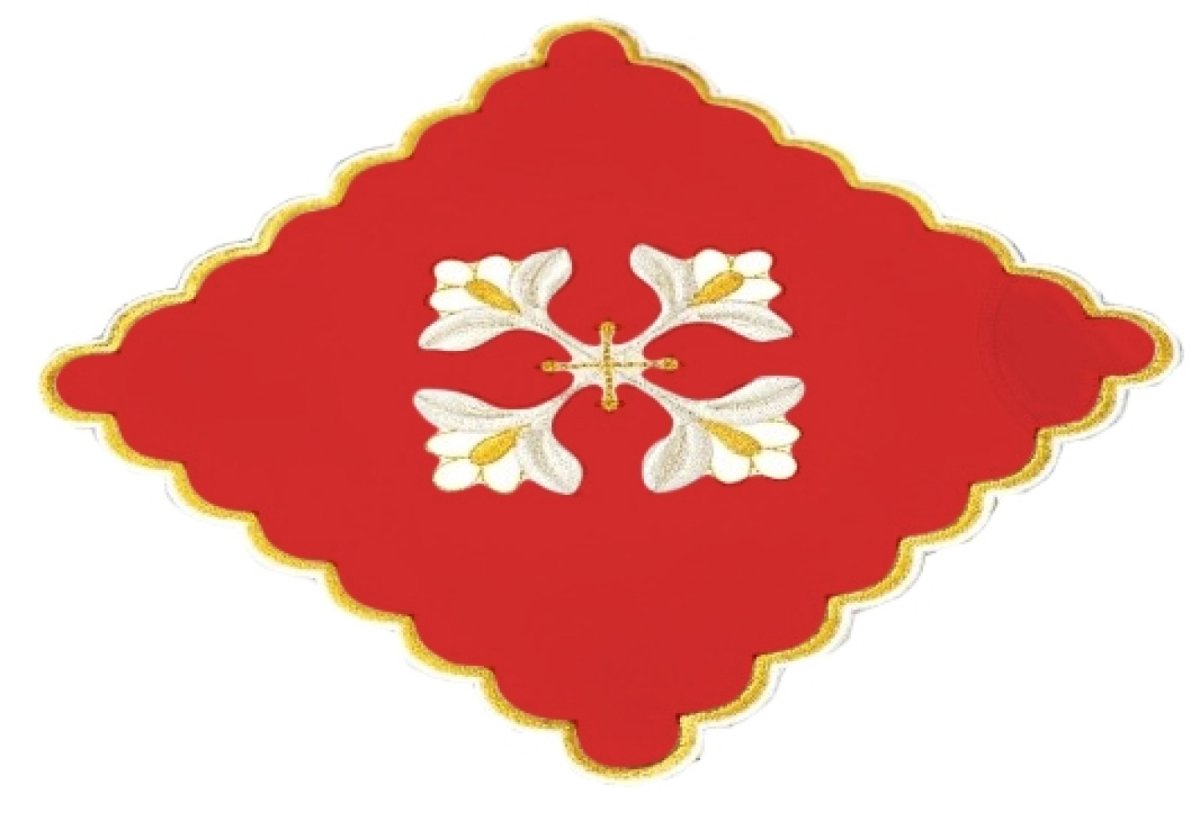 Palla per calice ricamata con simbolo IHS con filati dorati e colorati.