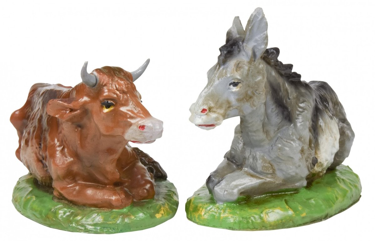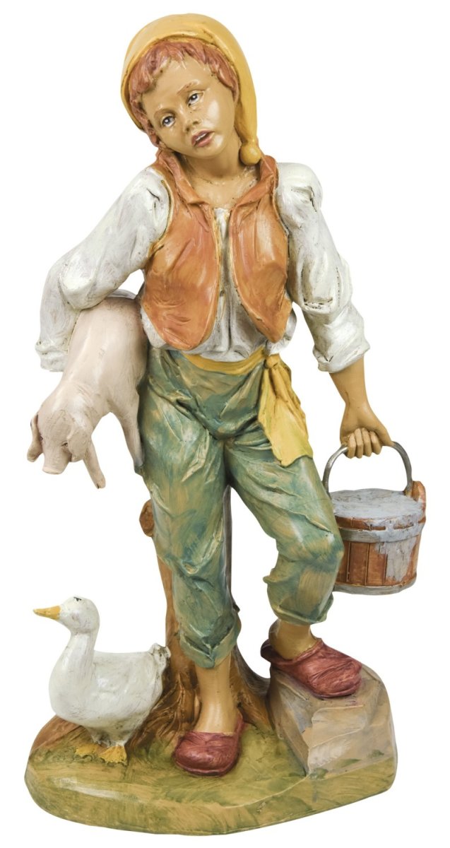 statua pastorello con cesti di verdura in lattice di gomma dura.