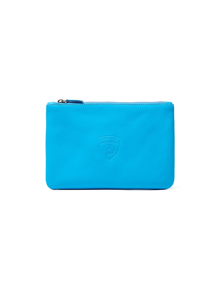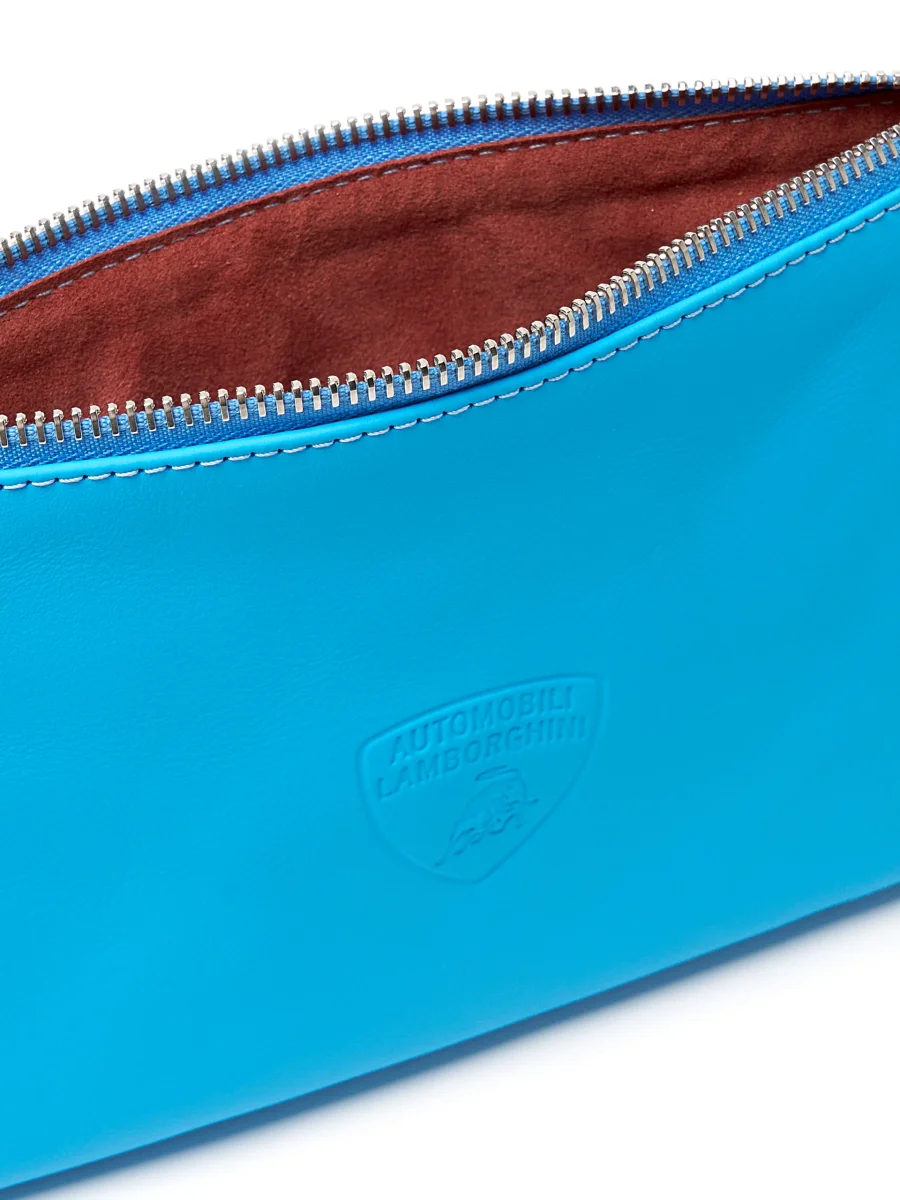 Salvaged high-quality leather originating from Sant’Agata Bolognese is ethically manufactured in a socially responsible way to give this slim clutch bag – customised with a hot-printed shield logo – its unique features.